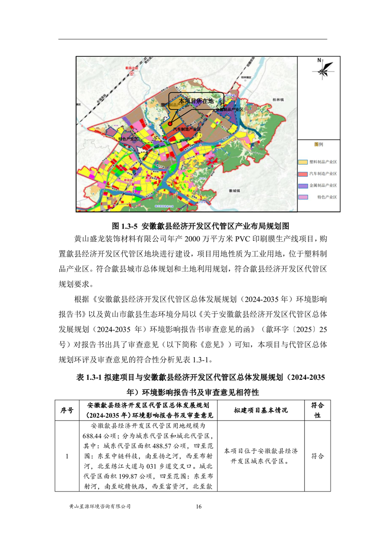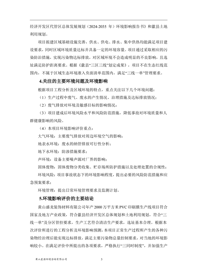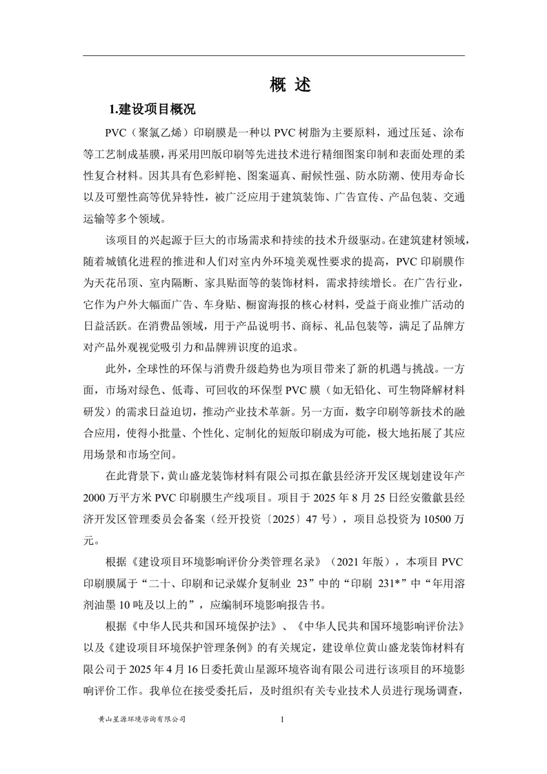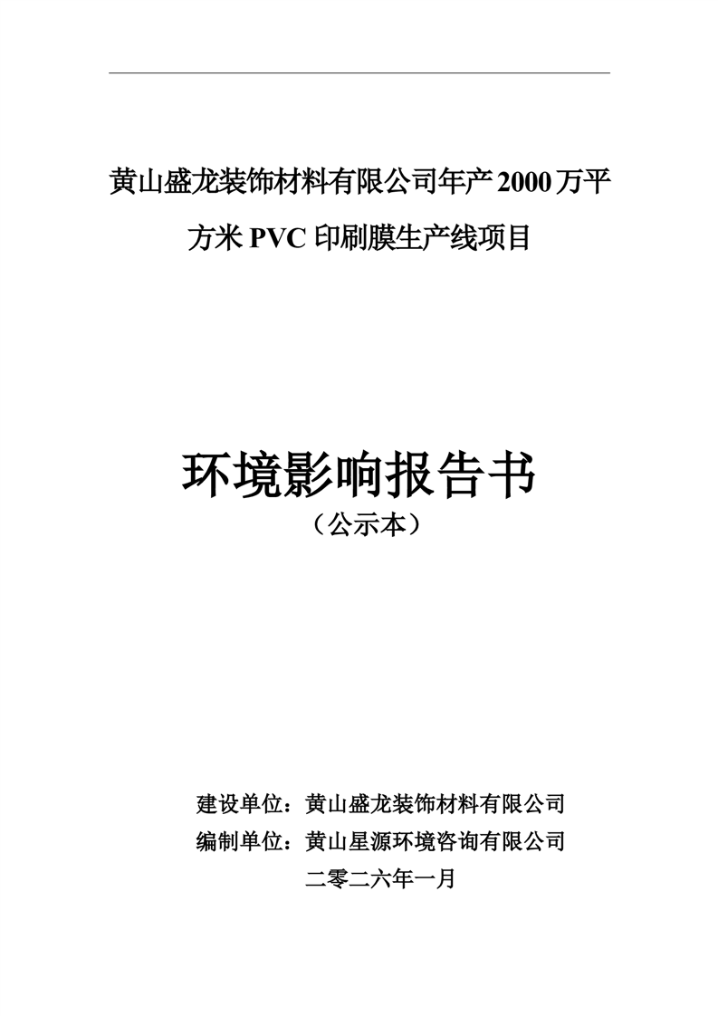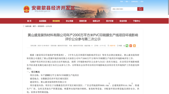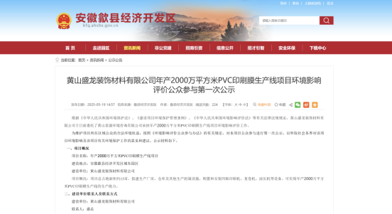 我单位于2025年5月15日委托黄山星源环境咨询有限公司编制黄山盛龙装饰材料有限公司年产2000万平方米PVC印刷膜生产线项目环境影响报告书,于2025年5月19日通过本项目所在地的政府网站(安徽歙县经济开发区网站)进行了第一次公示,公开了下列信息:
