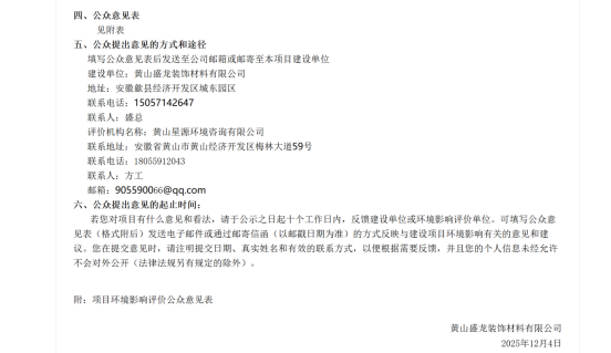 2025 年12月4日到2025 年12月17日在安徽歙县经济开发区城东代管区黄山盛龙装饰材料有限公司拟建地块旁、安徽歙县经济开发区网站等公告栏处进行了张贴公示,张贴公告处为项目所在地公众易于知悉的场所,张贴区域符合《环境影响评价公众参与办法》的要求。