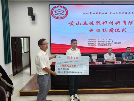 近日,在歙县中学80周年校庆之际,黄山运佳装饰材料有限公司向歙县中学捐赠价值32万元的电脑,用于学校“爱心助梦”机房的建设。