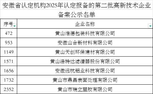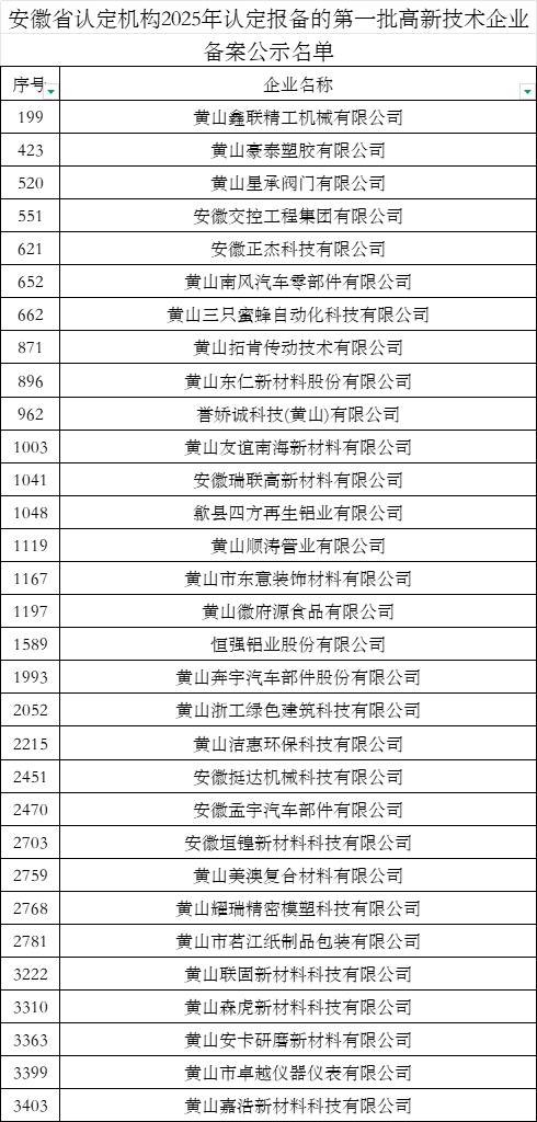 近日,全国高新技术企业认定管理工作领导小组办公室对安徽省认定机构2025年认定报备的第一批、第二批高新技术企业进行了备案公示,歙县经开区第一批、第二批申报的38家企业全部上榜。