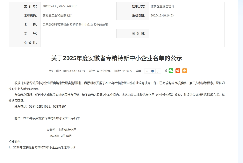 近日,安徽省工信厅发布《关于2025年度安徽省专精特新中小企业名单的公示》,全市46家企业入选名单,其中歙县经开区14家企业位列其中,为“专精特新”企业矩阵再添生力军。近年来,歙县经开区以创新驱动为核心,构建全周期培育体系,推动产业链与创新链深度融合,形成“雁阵式”优质中小企业发展格局,为县域经济高质量发展注入强劲动能。